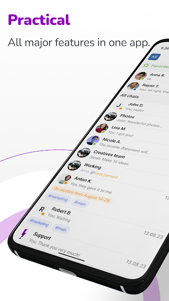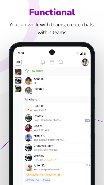 Общее рабочее пространство, для чатов/файлов и групп. Управлять членами в команде. Создайте группы участников для важных и быстрых упоминаний. Создайте чаты в команде. Эти чаты будут доступны исключительно только для членов команды.