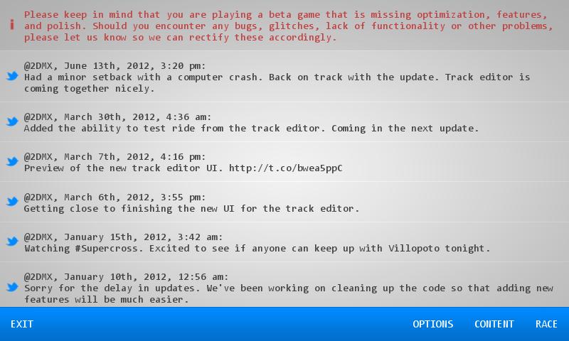 2D Motocross Racing для вашего устройства Android. Гонка против часов на различных треках. Думаете, вы можете сделать забавный трек? Попробуйте редактор треков и построите все, что вы можете себе представить.