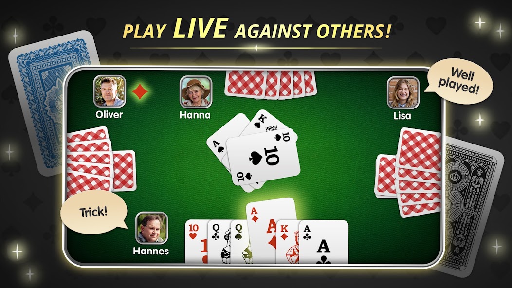 - Играйте в живую Doppelkopf против реальных противников в любое время.