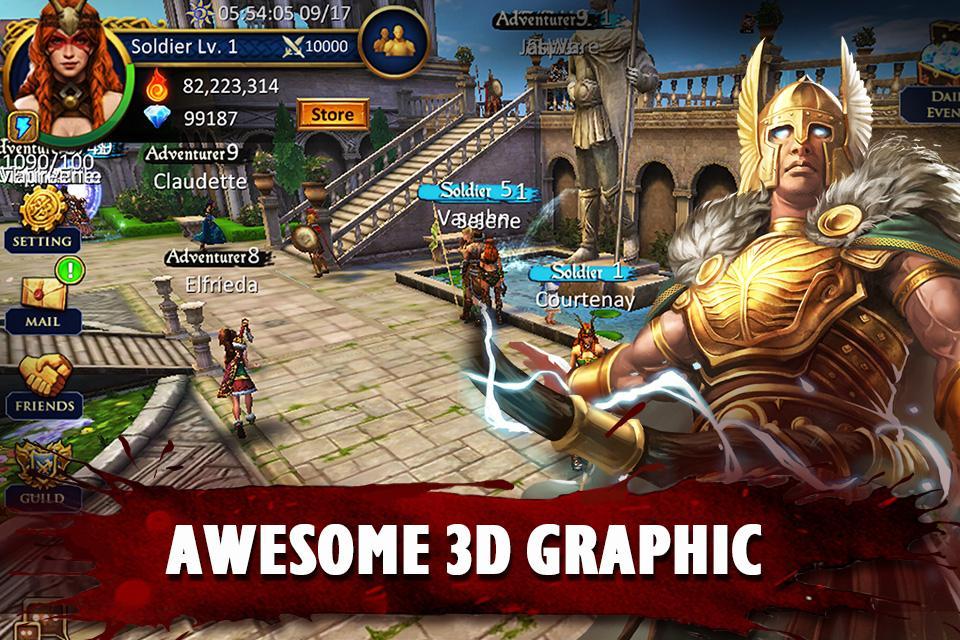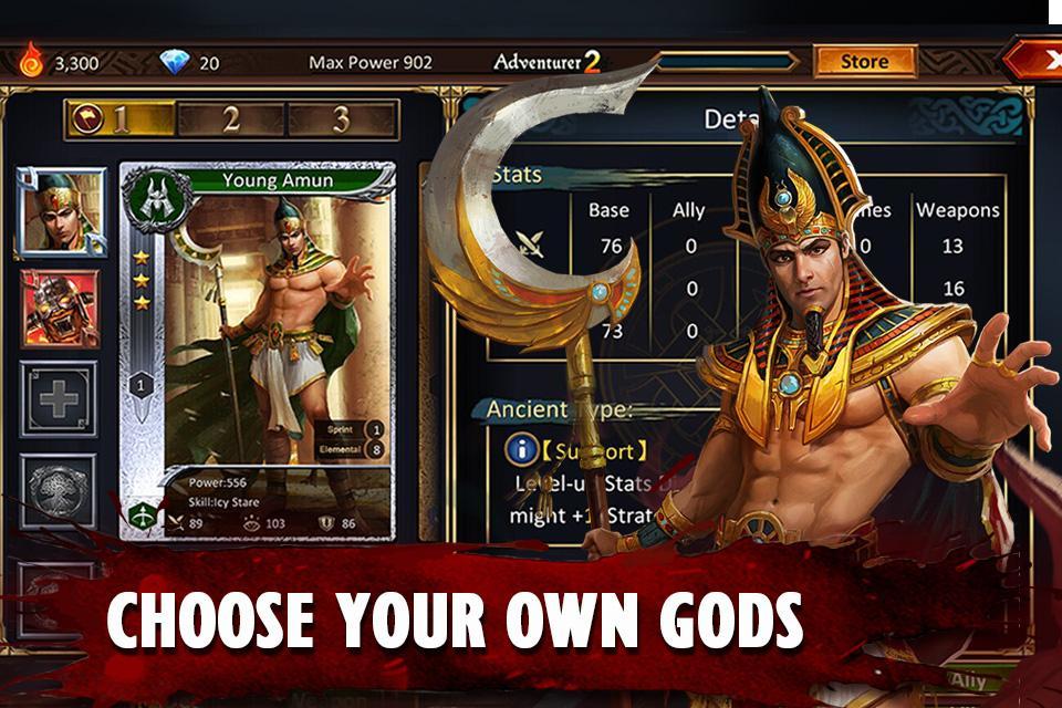 Показывая самые могущественные герои и древние на земле, призывайте силы Тора, Геркулеса, Зевса и богини Афины, чтобы помочь вам в битве. Бросить на огненные огни Тиамата и победить своих врагов с мучительным проклятием Медузы. Исследуйте обширный 3D World, когда игрок путешествует от норвежского рыбацкого города в египетские гробницы и по всему миру в спокойный греческий сад.