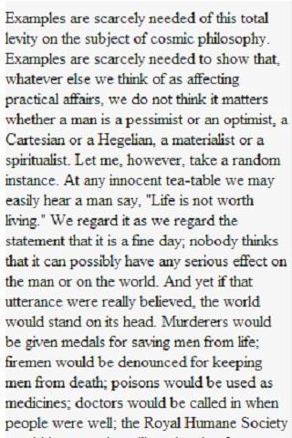 มันเป็นเรื่องโง่เขลาโดยทั่วไปสำหรับนักปรัชญาที่จะจุดไฟเผานักปรัชญาคนอื่นในตลาด Smithfield เพราะพวกเขาไม่เห็นด้วยในทฤษฎีของจักรวาล ที่ทำบ่อยมากในความเสื่อมโทรมครั้งสุดท้ายของยุคกลางและมันล้มเหลวโดยสิ้นเชิงในวัตถุของมัน แต่มีสิ่งหนึ่งที่ไร้สาระและไร้ประโยชน์มากกว่าการเผามนุษย์สำหรับปรัชญาของเขา นี่คือนิสัยของการบอกว่าปรัชญาของเขาไม่สำคัญและสิ่งนี้เกิดขึ้นในระดับสากลในศตวรรษที่ยี่สิบในช่วงเวลาแห่งการปฏิวัติครั้งใหญ่ ทฤษฎีทั่วไปมีอยู่ทุกหนทุกแห่ง หลักคำสอนเรื่องสิทธิของมนุษย์ถูกไล่ออกกับหลักคำสอนเรื่องการล่มสลายของมนุษย์ ต่ำช้าเองก็เป็นเทววิทยาเกินไปสำหรับเราในวันนี้ การปฏิวัติตัวเองเป็นระบบมากเกินไป Liberty เองนั้นมีความยับยั้งชั่งใจมากเกินไป เราจะไม่มีภาพรวม Mr. Bernard Shaw ได้นำเสนอมุมมองใน epigram ที่สมบูรณ์แบบ: "กฎทองคือไม่มีกฎทอง" เรามีมากขึ้นเพื่อหารือเกี่ยวกับรายละเอียดทางศิลปะการเมืองวรรณกรรม ความเห็นของผู้ชายเกี่ยวกับ Tramcars มีความสำคัญ ความคิดเห็นของเขาเกี่ยวกับเรื่องของบอตติเชลลี; ความคิดเห็นของเขาเกี่ยวกับทุกสิ่งไม่สำคัญ เขาอาจพลิกและสำรวจวัตถุล้านชิ้น แต่เขาต้องไม่พบวัตถุแปลก ๆ นั้นจักรวาล เพราะถ้าเขาทำเขาจะมีศาสนาและหลงทาง ทุกอย่างสำคัญ - ยกเว้นทุกสิ่ง