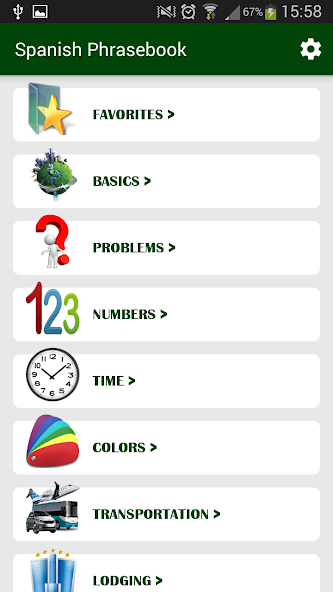 Spanish phrasebook ที่มีประโยชน์มากเมื่อคุณไปที่สเปนอาร์เจนตินาเม็กซิโกโคลัมเบียสาธารณรัฐโดมินิกันเวเนซุเอลาเปรูหรือประเทศที่พูดภาษาสเปนอื่น ๆ ! วลีนี้มีประโยคจากหมวดหมู่ที่แตกต่างกันเช่น: