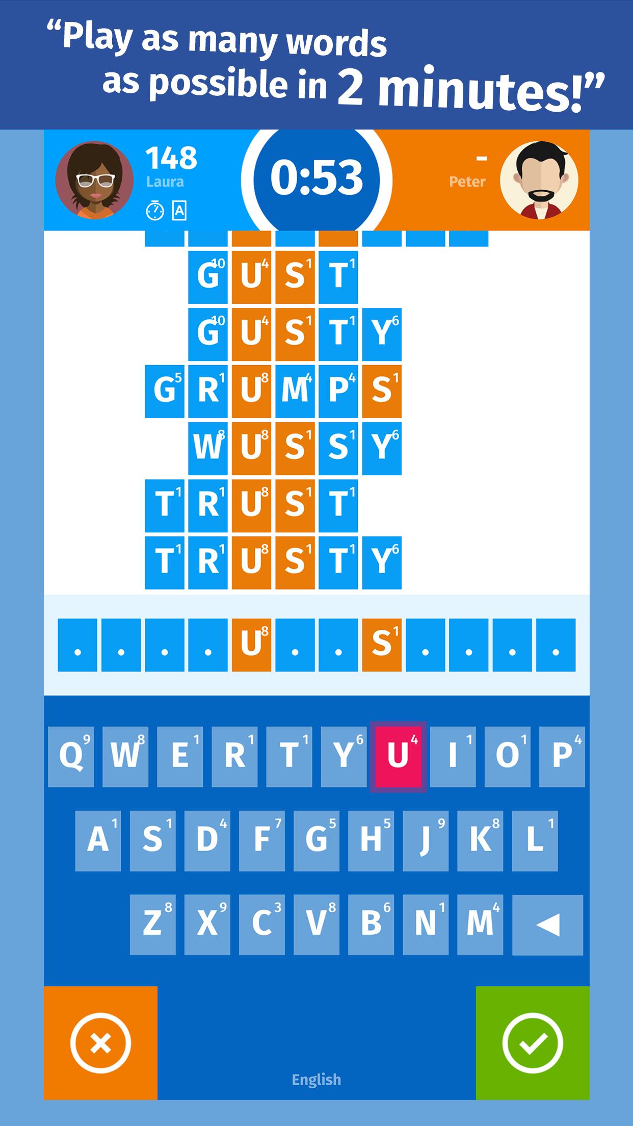 เล่นกับเพื่อนครอบครัวและคู่ต่อสู้แบบสุ่ม ผู้เล่นที่ชนะ 3 รอบก่อนเป็นผู้ชนะของการแข่งขัน นอกจากนี้คุณยังสามารถใช้ boosters เช่นค่าคำสองคำเพื่อให้คะแนนของคุณที่เพิ่มขึ้นเล็กน้อยเพื่อชนะ!