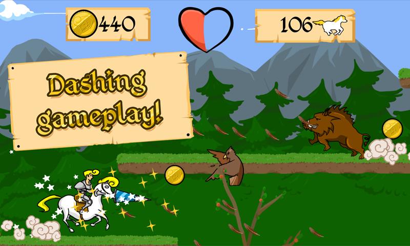 เจ้าหญิงได้รับการจับและมันเป็นงานของ Sir Dashing และงานของม้าที่ไว้ใจได้ของเขาที่จะพาเธอกลับมาดื่มชา กระโดดข้ามสิ่งกีดขวางและศัตรูและใช้หอกของคุณเพื่อทำการโจมตี รวบรวมเหรียญระหว่างทางไปยังดินแดนแห่ง Orcs และซื้อชุดหรืออาวุธใหม่