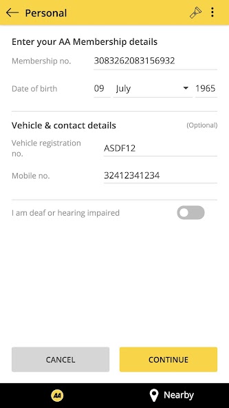 - 输入您的会员详细信息并设置该应用程序,以便在需要时请求AA Roadservice