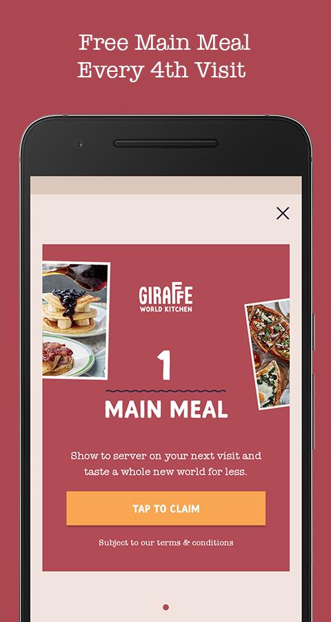 每4次访问每次访问Giraffe世界厨房会员,享受2次免费的主餐。