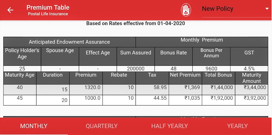 该部门通过邮政人寿保险和乡村邮政人寿保险提供各种类型的人寿保险政策。用户可以根据输入的输入来检查所有合格类型的邮政 /农村邮政邮政保险单类型的溢价。