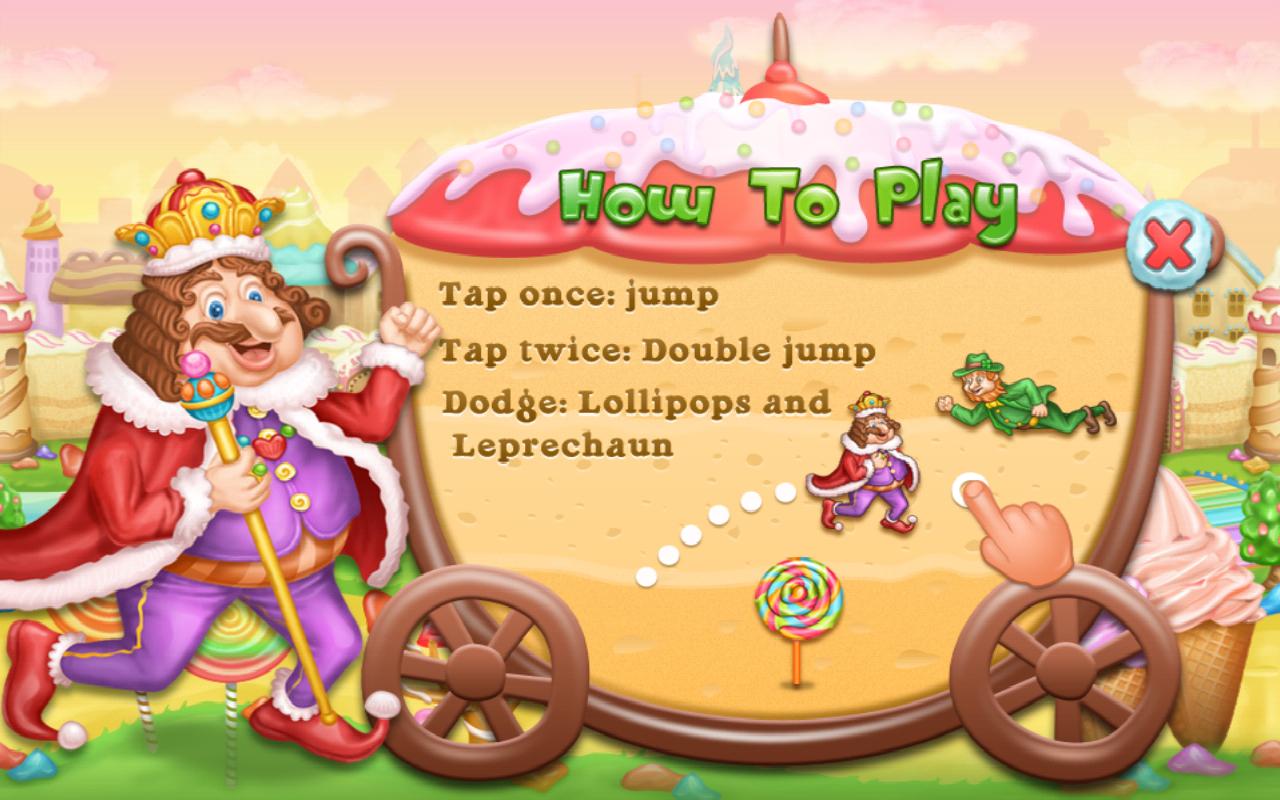 当您使用触摸手势指导自己在地图上时,收集心形的棒棒糖以获得生命。点击一次跳跃,两次双跳。您需要这样做才能避开诸如坏棒棒糖,妖精和巨型坑等障碍。当您死亡时,如果您剩下任何生命,您将重新产生。