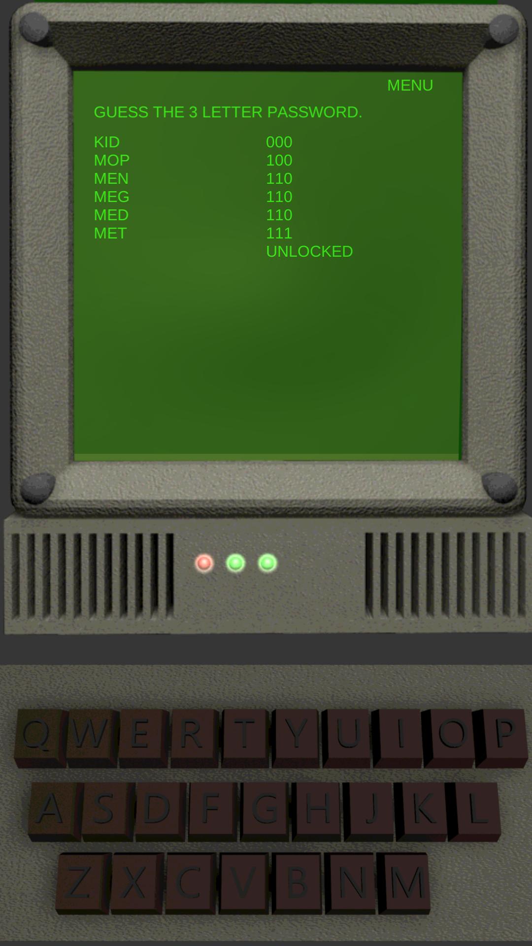有三个级别的困难,三个,四个和五个字母密码。