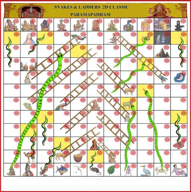 蛇和梯子是一部古老的印度棋盘游戏,如今被视为全球经典。 Paramapadham(Thayam)是英语的蛇和梯子;它是在1892年之前在印度古代创建的。它也被称为Parama Pada Sopanam,意思是达到最高位置(Parama Pada表示最高位置,而Sopanam表示步骤)。帕拉帕汉姆受到宗教的启发。被认为是一个人企图接触上帝的象征。梯子代表美德,蛇代表恶习。这些蛇的名字将它们与我们史诗般的故事联系起来。