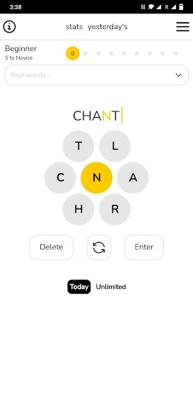 六个字母可在每个单词中使用,并且中间的字母在每个猜测中都是必不可少的。您应该收集至少四个字母的单词以开始赚取积分。您的单词越长,您得到的观点就越多。