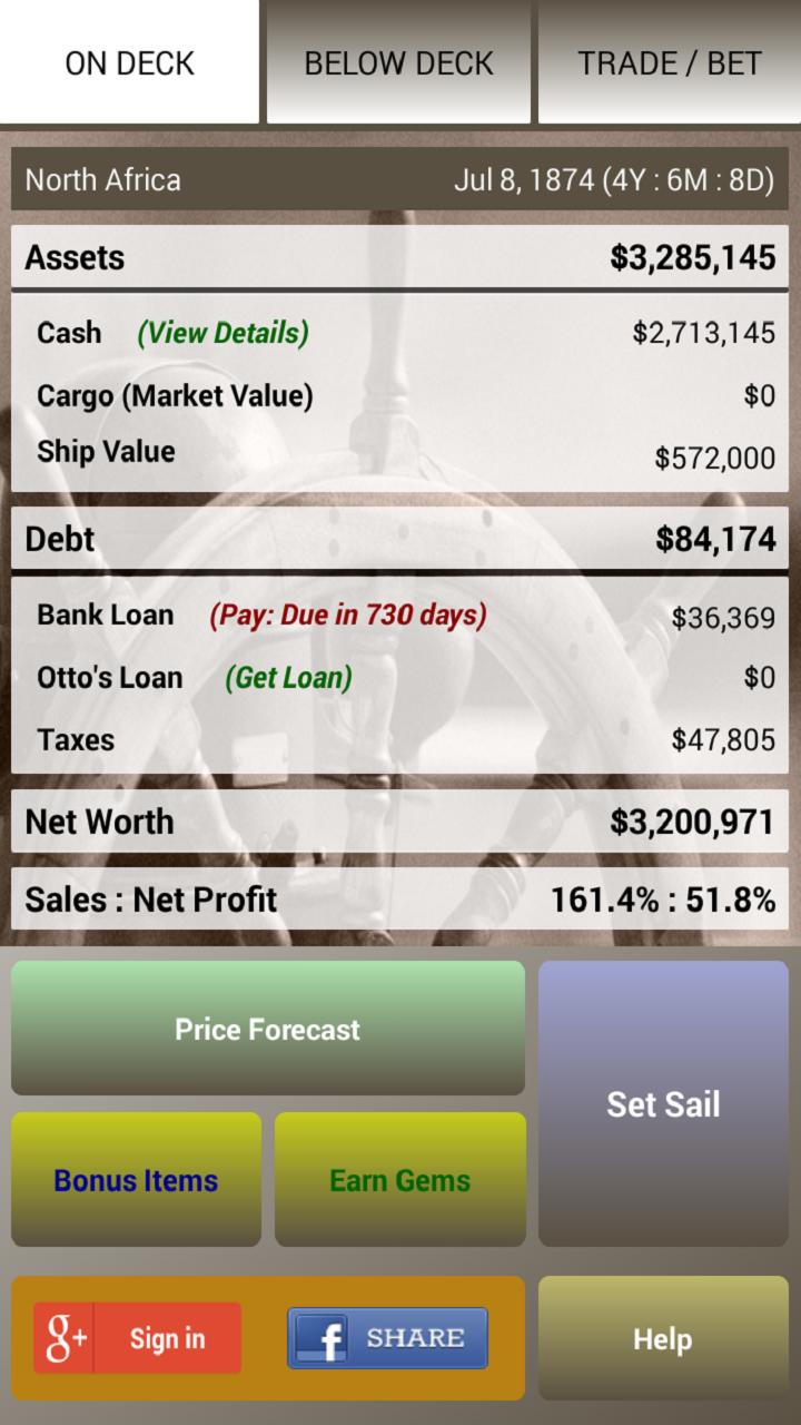 最終,您的目標是獲得數百萬(可能數十億)的資產,包括現金,船舶的價值和貨物。每次旅行都會增加您的淨資產!
