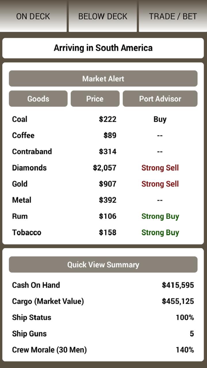 與海盜作鬥爭,還清官員,管理船員的士氣水平,並通過以其最低價格購買商品並以最高價格出售這些商品時,可以及時回到及時的旅程。如果時間不正確,您可以嘗試在紙牌遊戲中賭博以贏得遊戲現金。