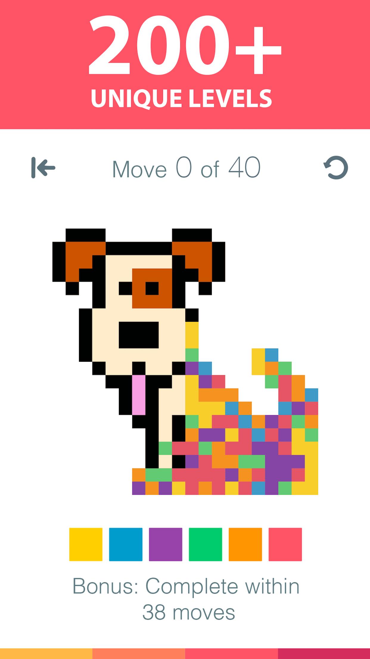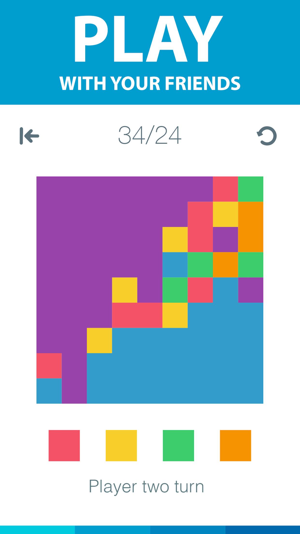 目標很簡單 - 在給定的動作中用一種顏色繪製整個遊戲板。紅色,橙色,黃色,綠色,藍色或紫羅蘭色。三思而後行,然後選擇可以使您通過級別而無需超過最大移動的正確方法。